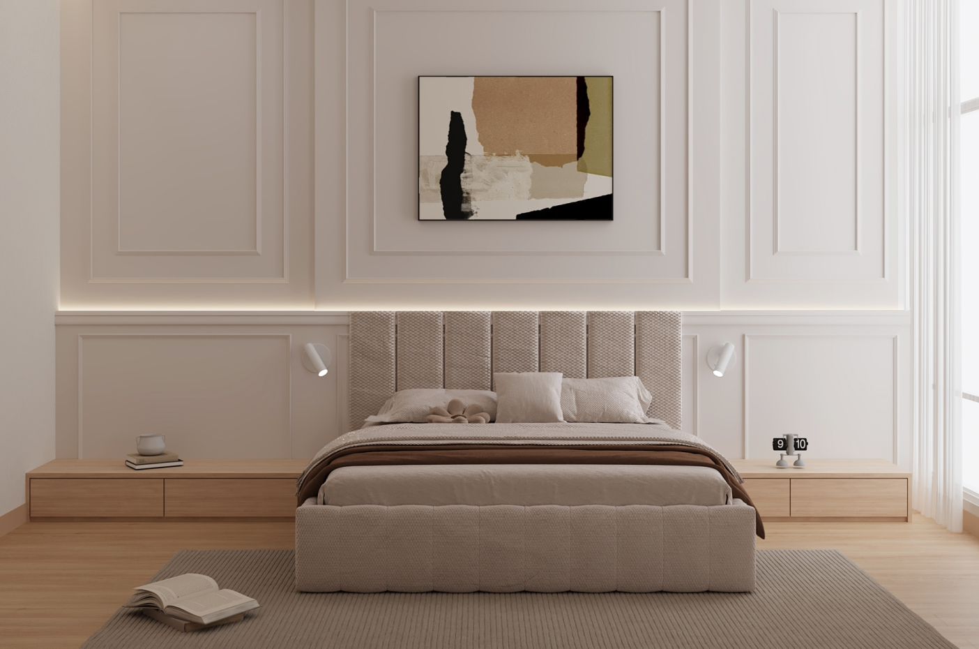 Light tones and subtle textures enhance the sense of space and serenity, while touches of gold, marble,